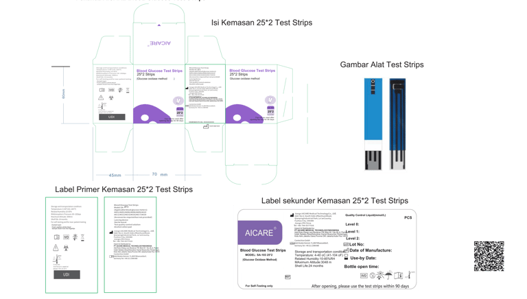 Strip tes glukosa darah sekali pakai untuk pengukuran kadar gula darah secara cepat dan akurat menggunakan metode Glucose Oxidase.